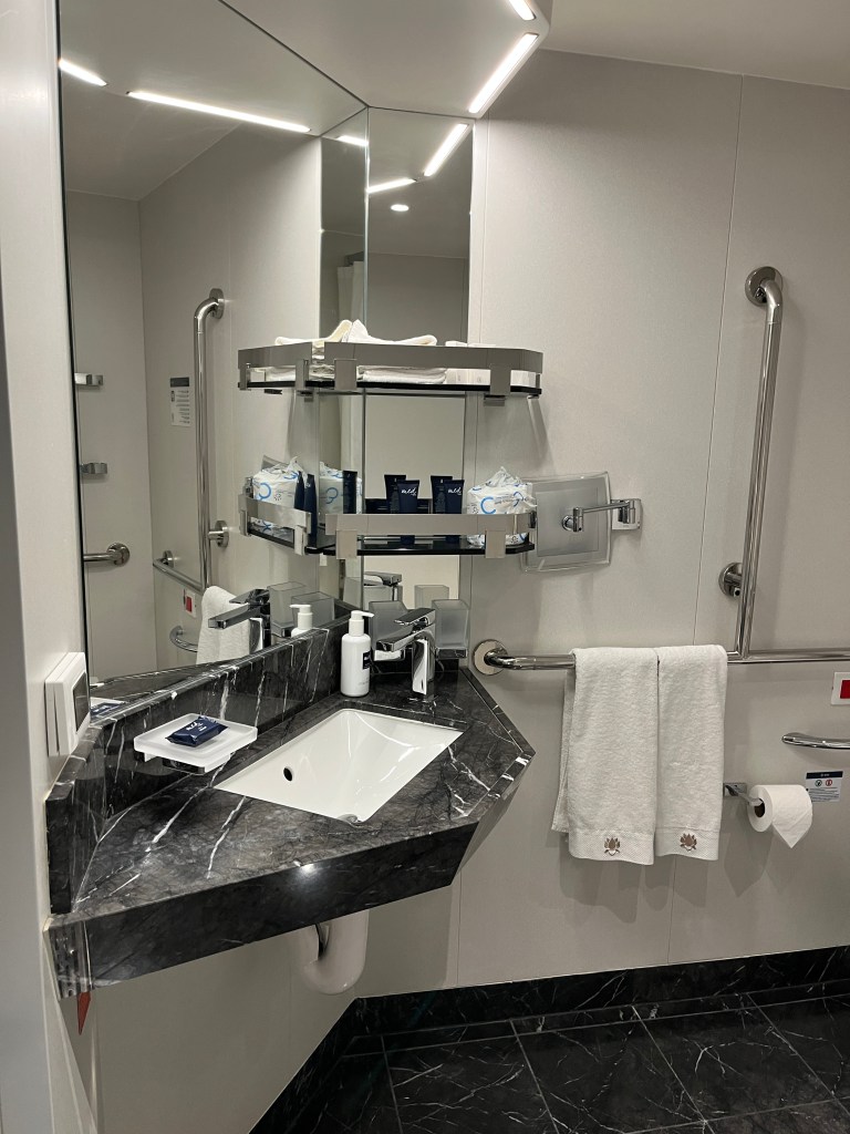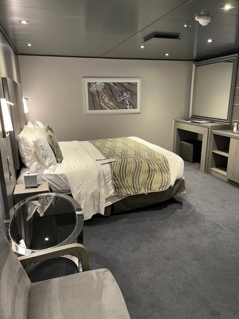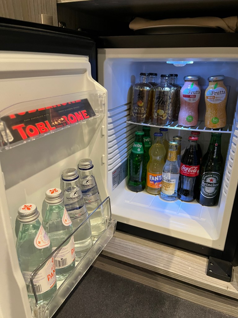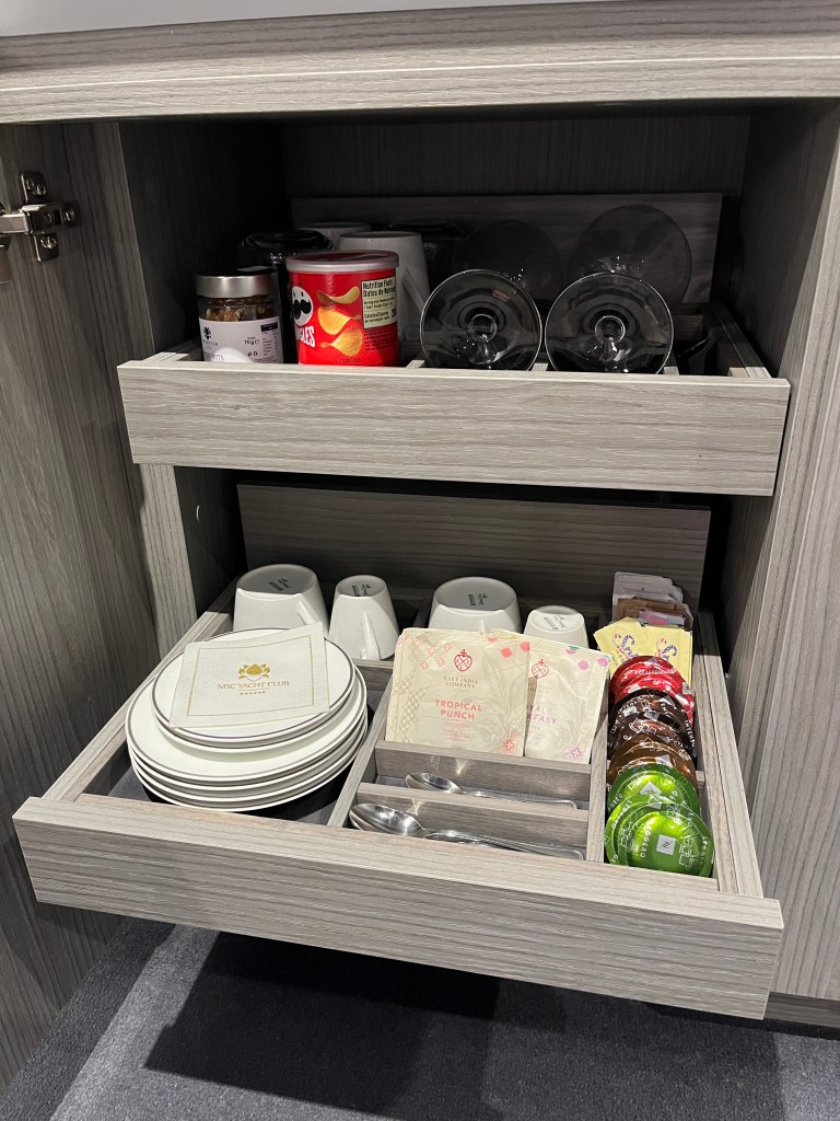 And it’s not just the amenities in the cabin, though those are really nice, too! The cabin is a few steps above the regular interior cabin I had last summer, which I thought was very nice. The cabin comes with an included minibar, coffee and tea maker, plus a bottle of liquor and mixers. (Not that you need it really – the Yacht Club also comes with a premium drink package that you can use around the ship.)