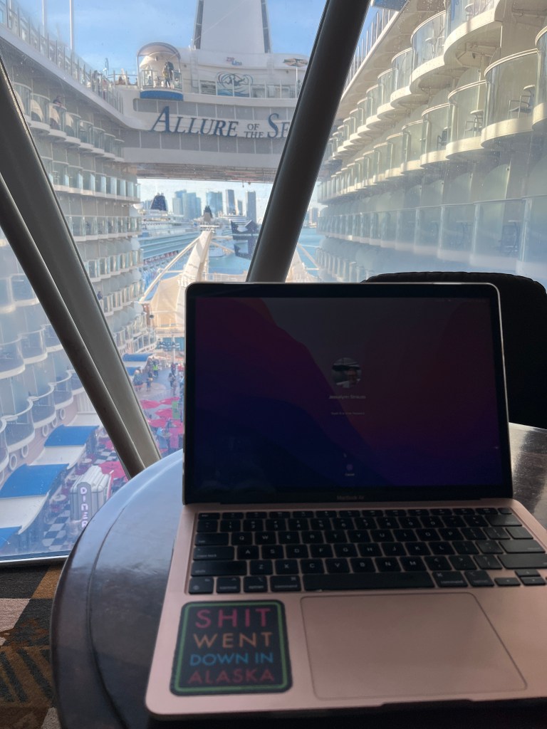 Plan for contingencies. I’ve had mostly good luck with cruise ship wi-fi: I’ve taken Zoom calls, downloaded and uploaded large files (though it takes awhile sometimes), and made phone calls using wi-fi calling. But sometimes the internet on a cruise ship just…doesn’t work.