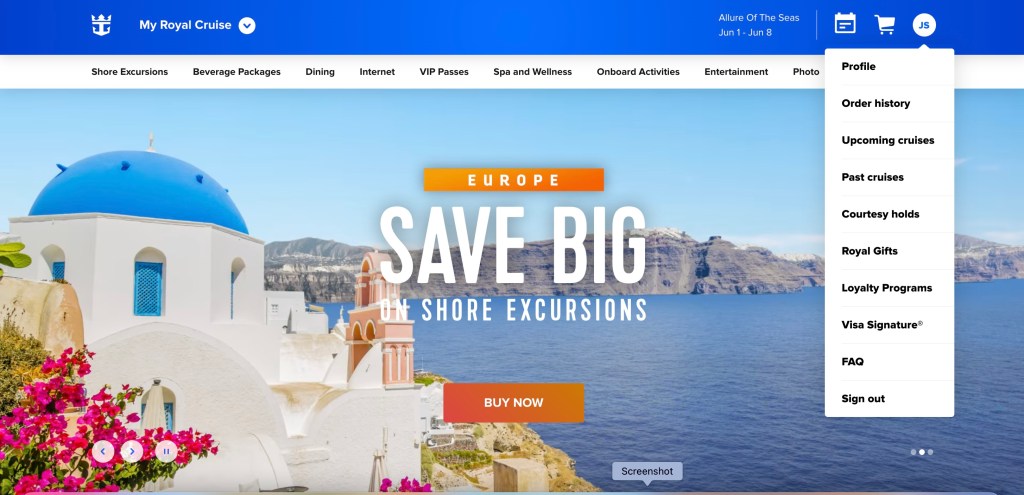 The first step is to find the place on the site where you can see your prior purchases. On Royal Caribbean, this is called your “Order History” and you’ll see it when you click on your initials at the top right of the screen.